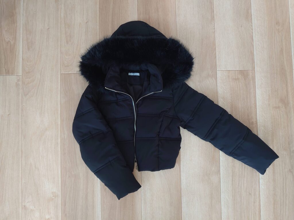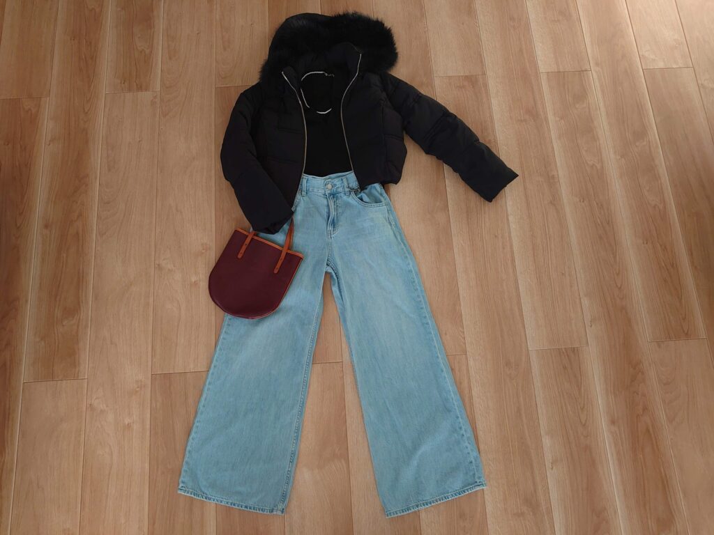- 黒ニット×ジーンズ×ダウン(定番カジュアル)