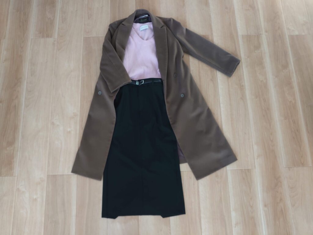 - ピンクニット×ナロースカート×ロングコート(きれいめ)