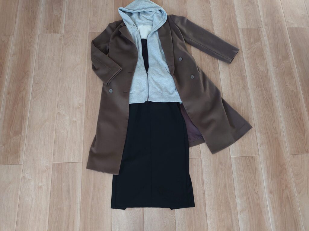 - パーカー×ナロースカート×ロングコート(カジュアルすぎず大人っぽい)